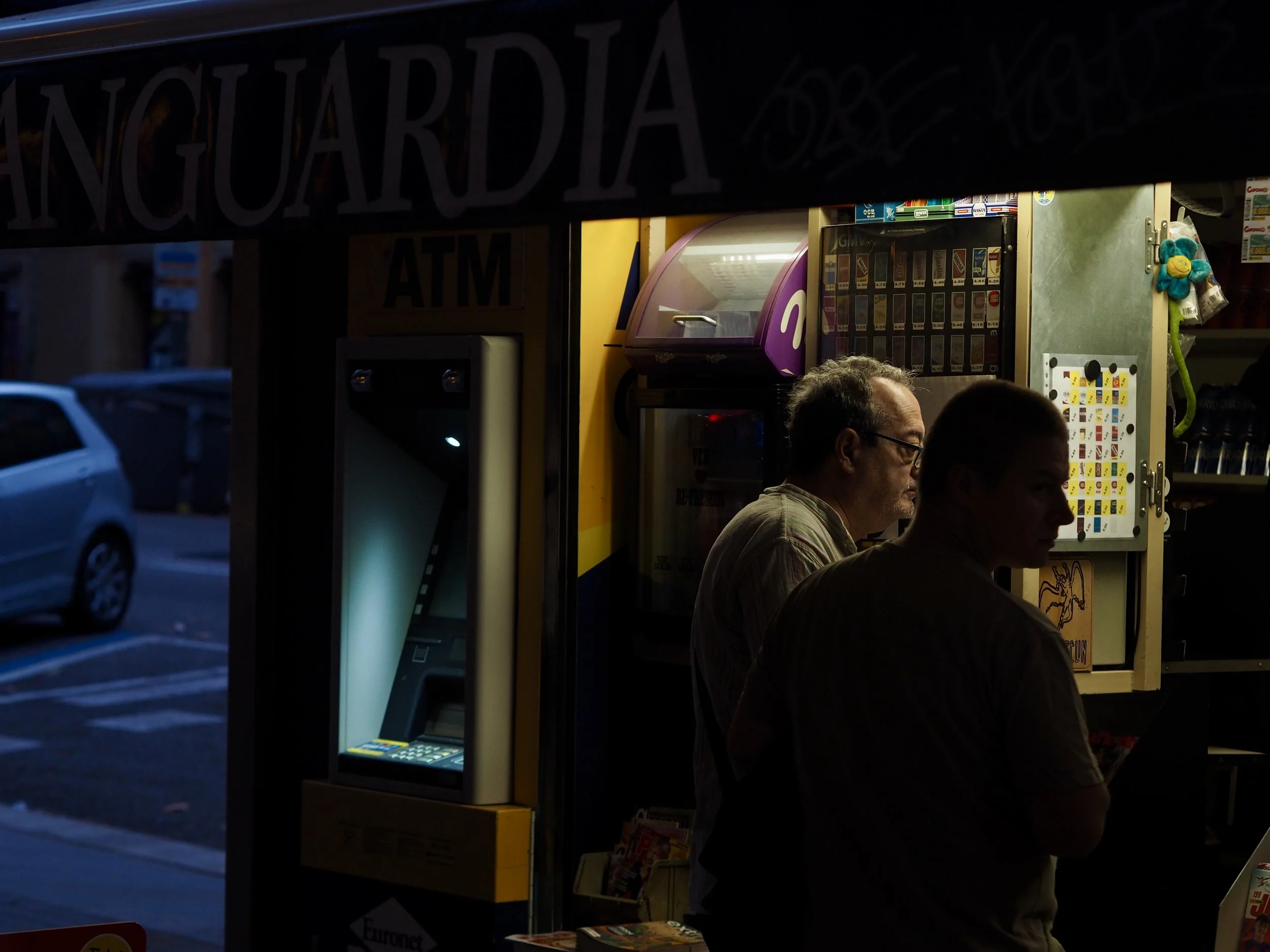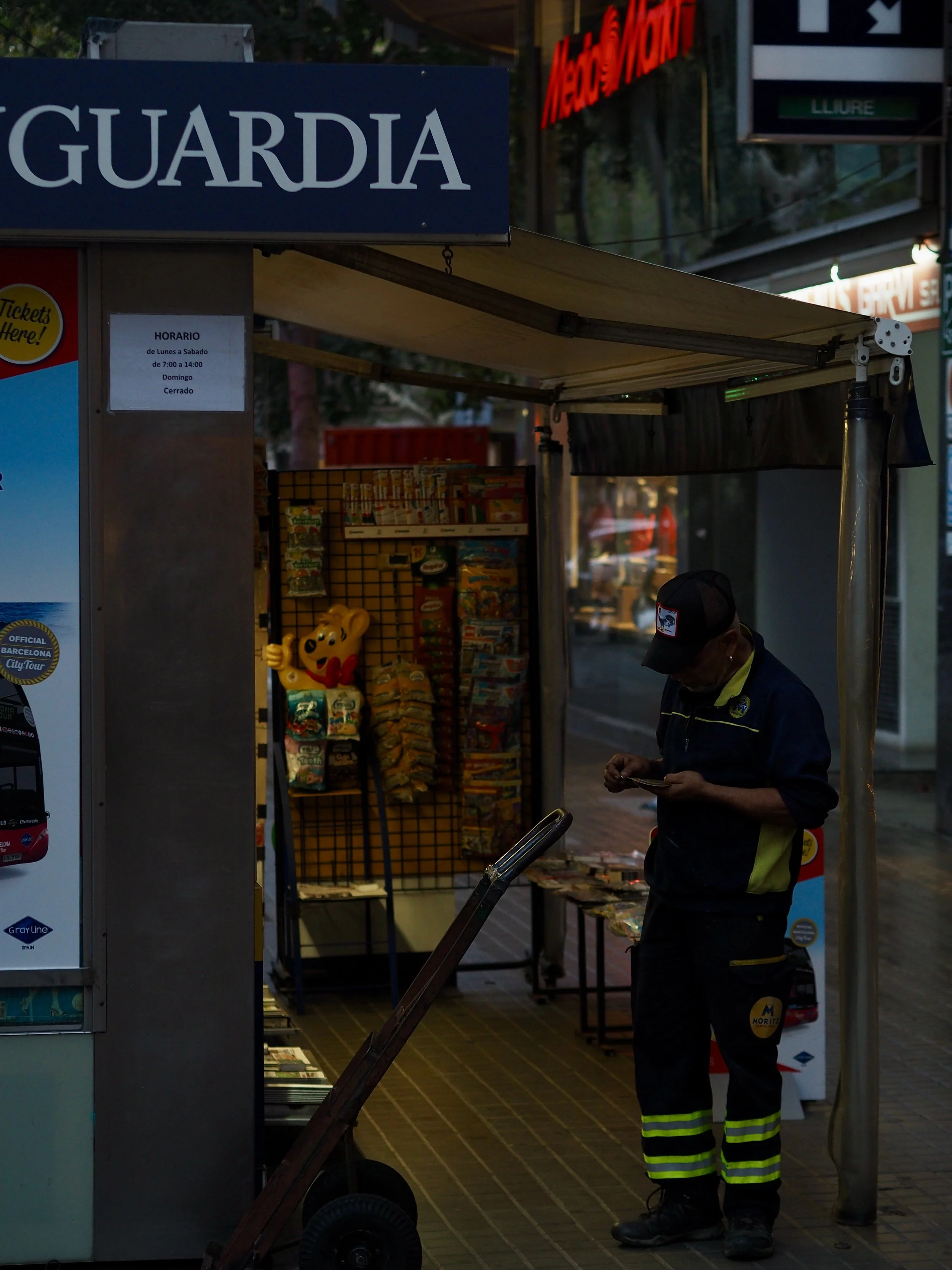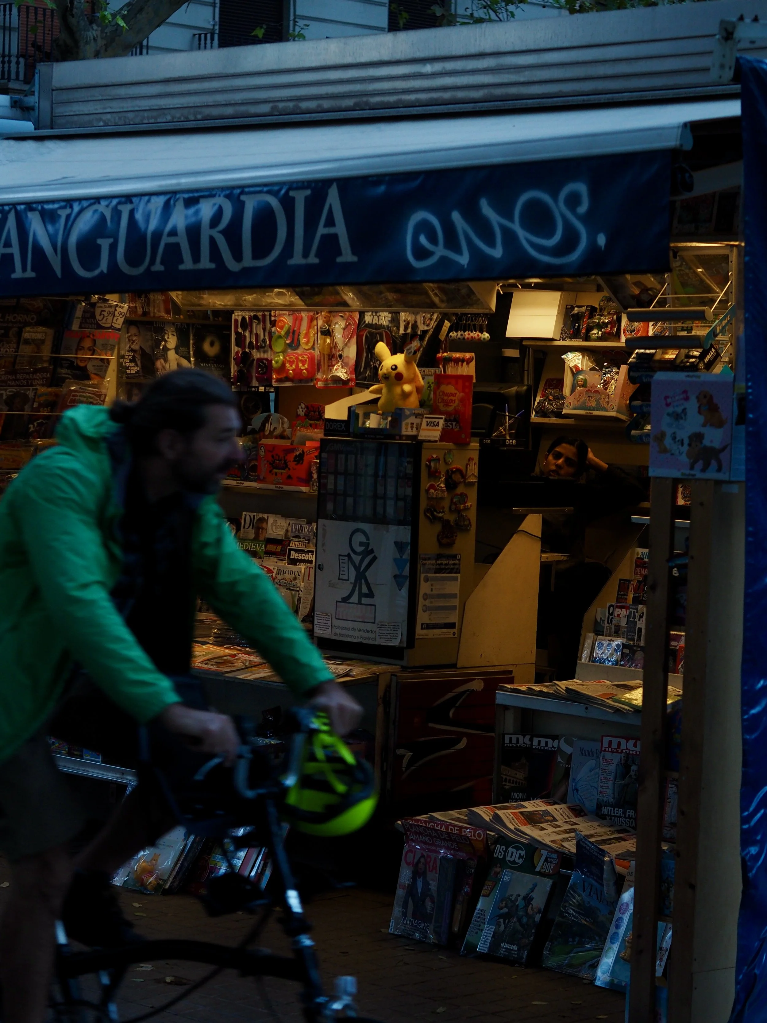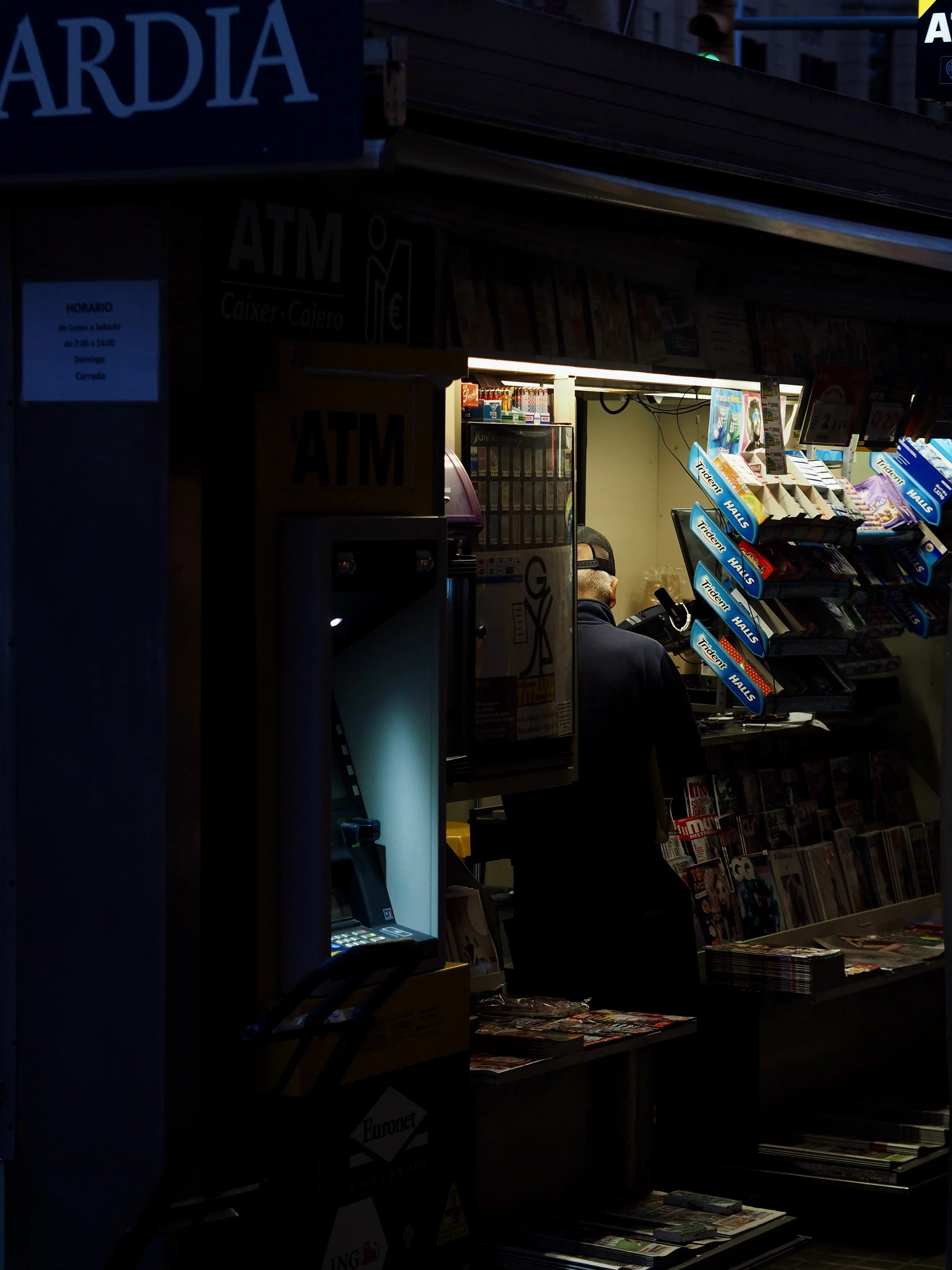 I’m referring to the standalone Newspaper kiosks which serve as a hub for convenience. They aren’t unique to Barcelona, with almost all large cities featuring their own version. I moved to Barcelona in 2023 and was the same as anybody arriving in a new city or culture - focussed on everything but the mundane. But after about 2 months I started to notice these stands everywhere I looked, most notably the ones branded with ‘La Vanguardia’, Catalonia’s leading newspaper. On my morning commute i’d observe exchanges between the those working behind the counter, delivery men and customers. I started taking my camera on my walk and would shoot these scenes as I passed by the two kiosks between my flat and university.